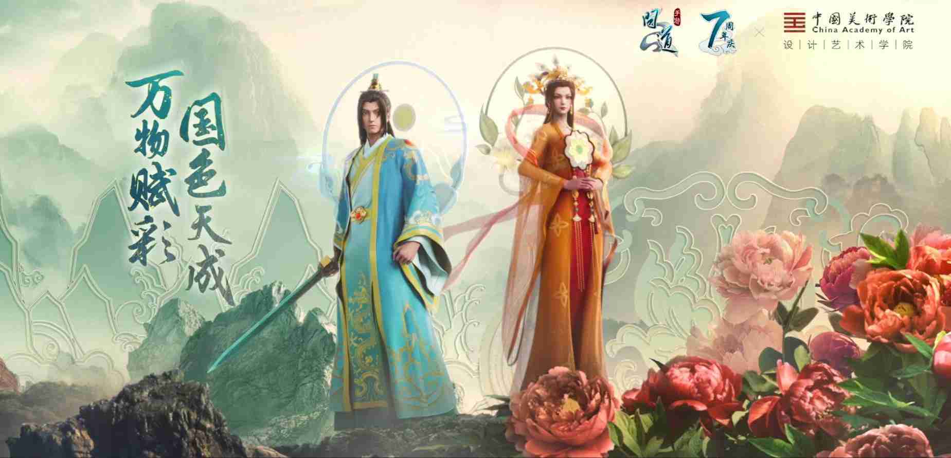 2023年4月,,,《问道手游》联动中国美术学院,,,,在游戏中融合了中国历史上不同时期的文化元素,,,,打造了“山河万象”与“凤鸣九霄”的国风时装。。在色彩配置方面,,,,创作团队基于对游戏角色特性的分析提取相应的文化内涵,,,,从每一种色彩的色相、、指代事物和情感出发对应角色属性,,选定服装的色彩搭配。。。。在纹样设计方面,,,创作团队结合游戏角色自身特殊的造型比例和形态,,,,在实际的纹样设计中进行了游戏语境下的活化演绎。。。男性角色集中使用了如蟒纹、、、、海水江崖纹、、、如意纹和云气纹等传统纹样元素,,,,女性角色则吸纳了凤凰纹、、、、牡丹纹、、卷草缠枝纹等元素,,,,组成以“双凤牡丹纹样”“缠枝牡丹纹”“金玉凤冠头饰”为主要纹样的游戏角色装饰图案系统。。。。