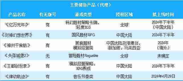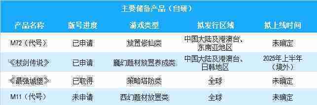 公司有多款储备产品,,,,涵盖放置类、、、策略类、、RPG、、、Roguelike等多元化游戏品类,,储备的主要自研和代理产品如下:::