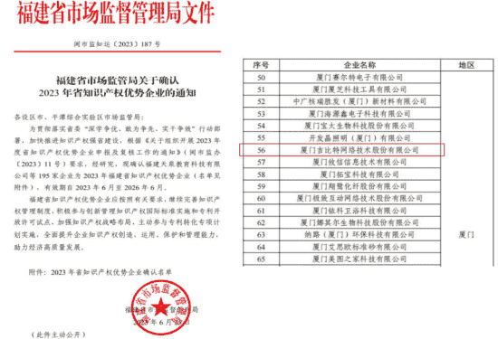 近日,,,,福建省市场监督管理局公示了2023年福建省知识产权优势企业名单,,,厦门亚星管理网络技术股份有限公司(以下简称“亚星管理”或“公司”)榜上有名。。